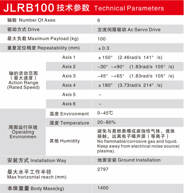JLRB100 features: wrist load capacity is 100 kg, maximum working radius of 2797 mm.